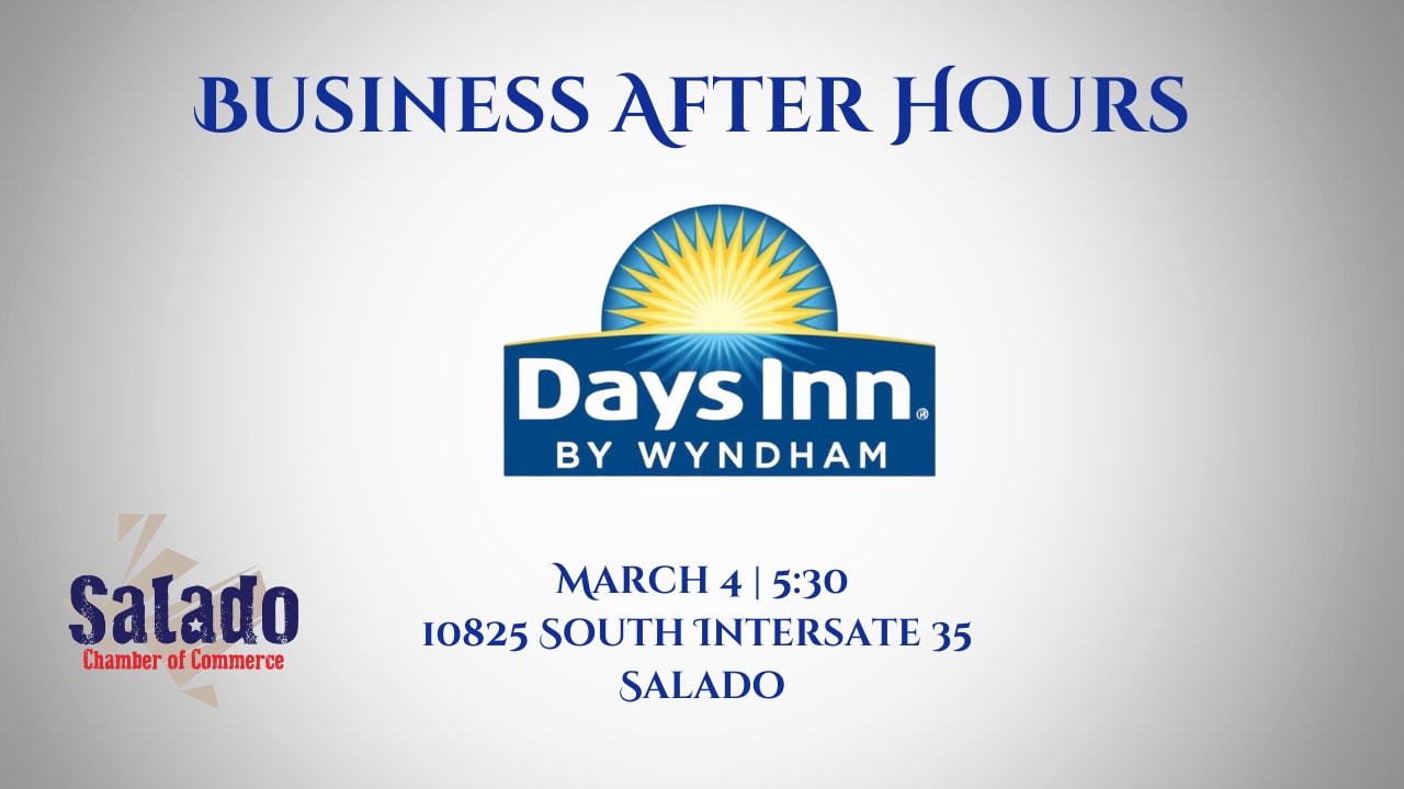 Join us for March Business After Hours sponsored by Days Inn by Wyndham. The event is Tuesday, March 4, 2025 from 5:30 - 7:00 p.m. Business After Hours is an opportunity for Businesses to develop new business relationships in a relaxed, social environment by joining other busy professionals after hours. This event will be full of fun, food, and networking!