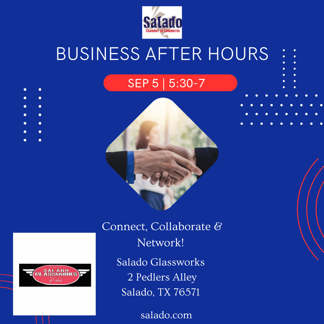 Join us for our September Business After Hours hosted by Salado Glassworks. The event is Tuesday, September 5 from 5:30 -7 pm. Business After Hours is an opportunity for businesses to develop new business relationships in a relaxed, social environment by joining other busy professionals after hours. This event will be full of fun, food, and networking! Registration is not required for this event. For questions, call (254) 947-5040. Salado Glassworks is located at 2 Peddlers Alley in Salado. About our host: Salado Glassworks is a working glassblowing studio and gallery that specializes in one of a kind custom blown fine art glass.
