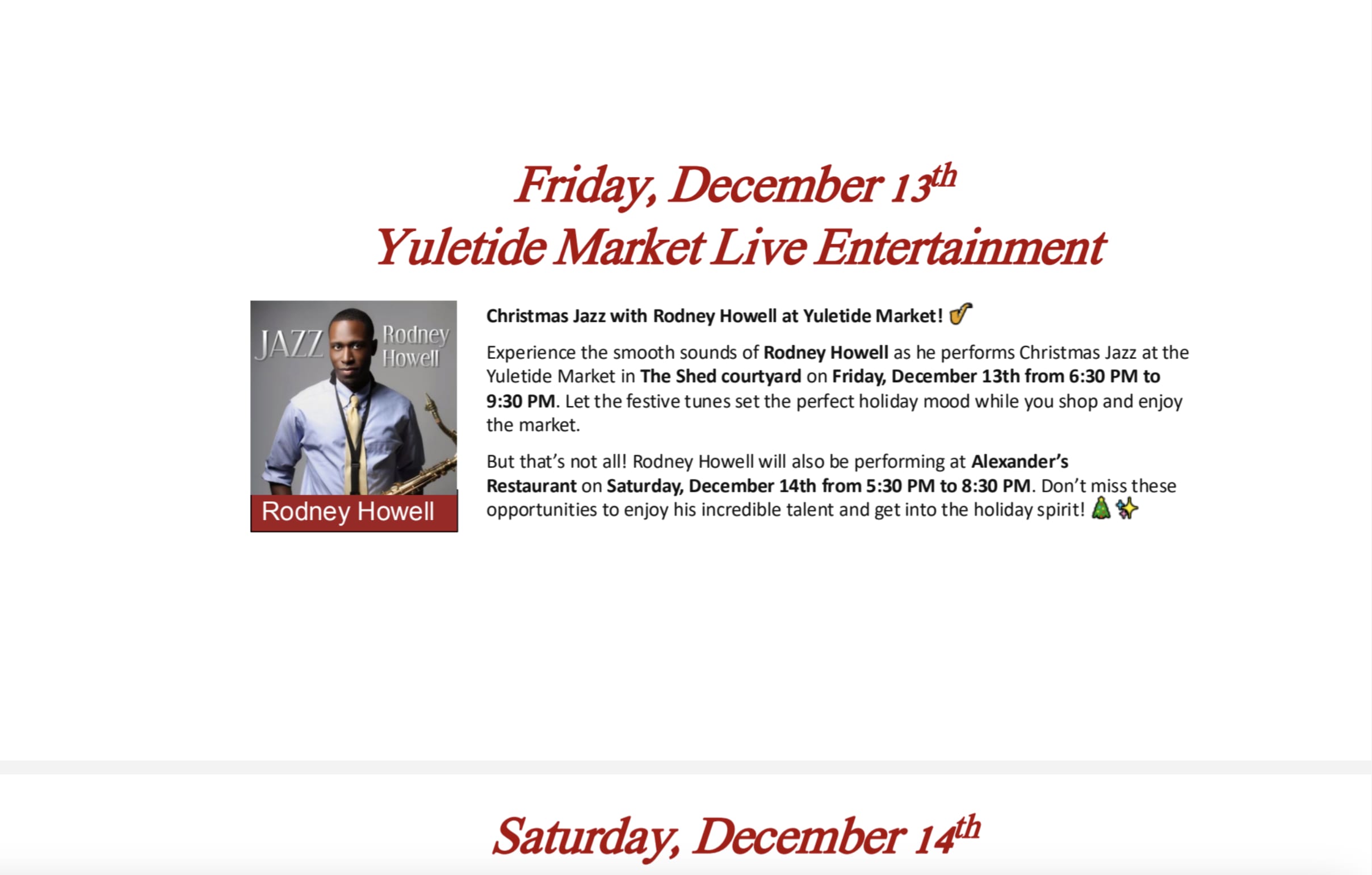 Experience the smooth sounds of Rodney Howell as he performs Christmas Jazz at the Yuletide Market at Alexander's Restaurant on Saturday, December 14th from 5:30 pm to 8:30 pm. Don't miss this opportunity to enjoy incredible talent and get into the holiday spirit.