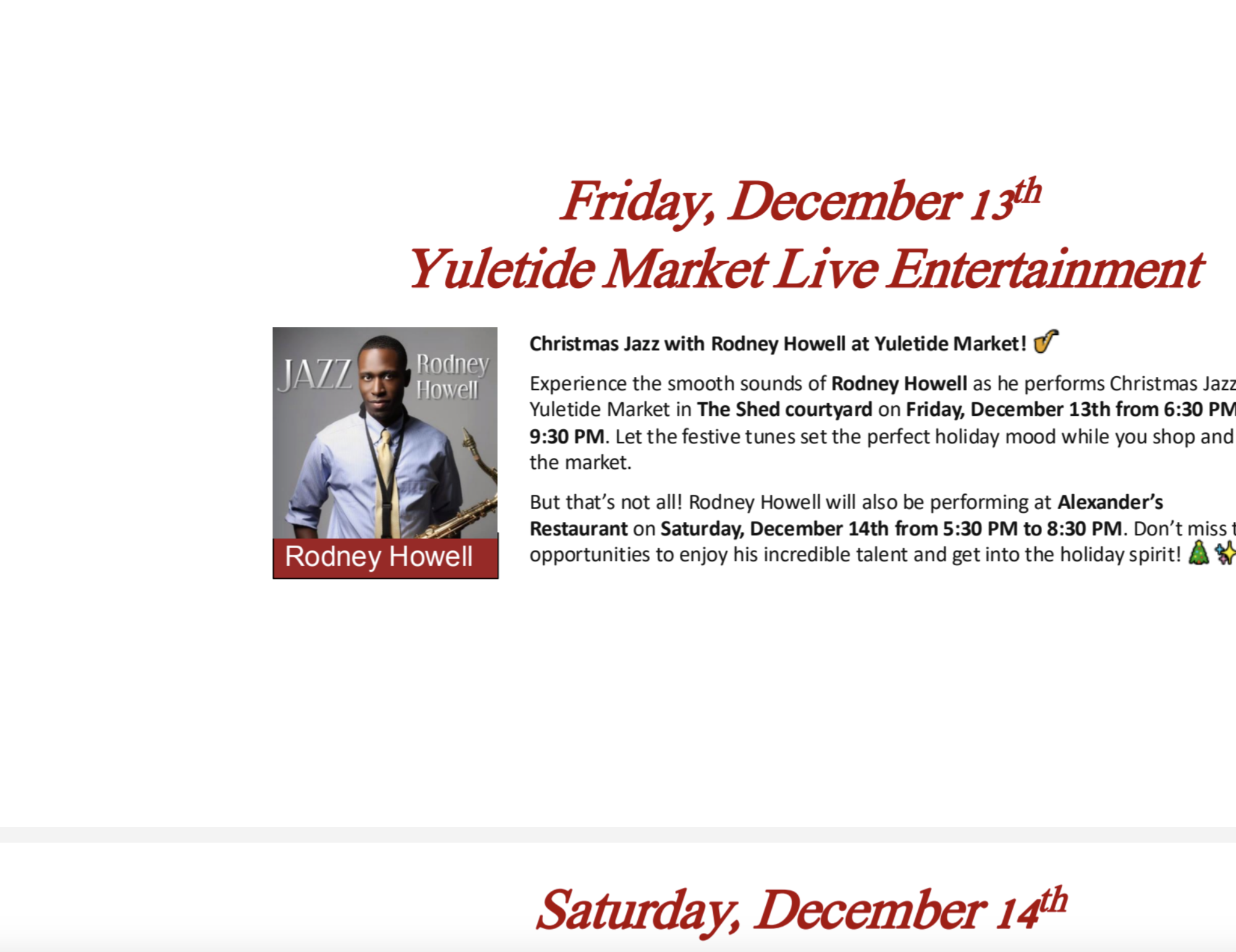 Experience the smooth sounds of Rodney Howell as he performs Christmas Jazz at the Yuletide Market at The Shed courtyard on Friday, December 13th from 6:30 pm to 9:30 pm. Let the festive tunes set the perfect holiday mood while you shop and enjoy the market.
