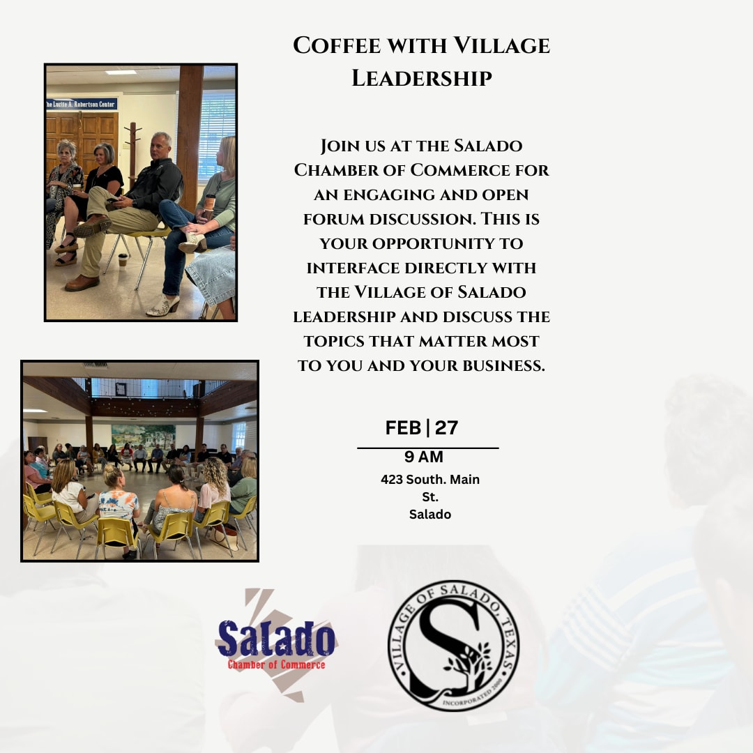 Join us for Coffee with Village Leadership. This open forum allows the business community to interface with Village leadership to discuss subjects that are most important to them. Hope to see you there!Images