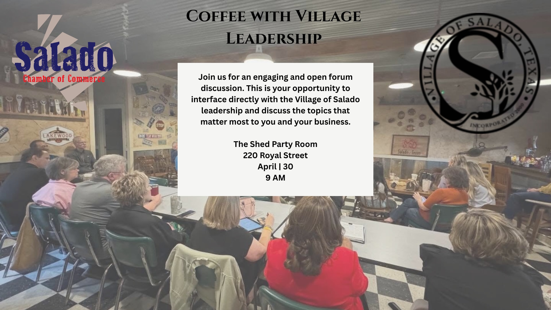 Join us at the The Shed Party Room for an engaging and open forum discussion. This is your opportunity to interface directly with the Village of Salado leadership and discuss the topics that matter most to you and your business.Images