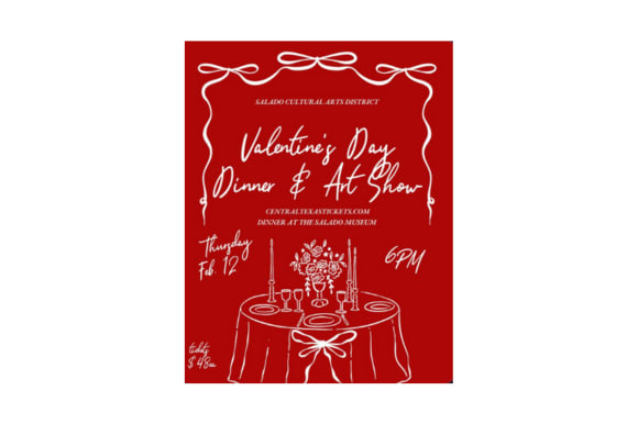 The Salado Cultural Arts District Board is thrilled to present the annual Heart for the Arts Valentine Celebration—an enchanting evening where creativity, community, and artistry take center stage, all in support of Salado’s thriving arts cultural scene. Make this Valentine season truly unforgettable—join us for Salado’s most anticipated celebratory dinner! Our annual Heart for the Arts Celebration offers the perfect setting for a Valentine’s night out, where creativity, community spirit, and romance unite. Expressions of Love Art Show & Sale Celebrate with us at the highly anticipated “Expressions of Love” Art Show & Sale on Thursday, February 12, 2026, from 6:00 PM to 8:30 PM at the Salado Museum and College Park (423 South Main Street, Salado). Revel in an exclusive showcase of Salado’s outstanding local artists, each displaying 12”x12” original works across a variety of media. This inspiring event features live music, a delicious Italian dinner, decadent chocolate desserts, and captivating presentations—all set in a romantic, art-filled atmosphere. Mix and mingle with artists and fellow art lovers at the 6:00 PM Meet & Greet, enjoy wine and hors d’oeuvres, and savor a meal crafted for a night to remember. Plus, be present for the exciting announcement of our new corporate sponsors, whose generous support is helping us build an even brighter future for the arts in Salado. Tickets are $48 per person, available for purchase at https://centraltexastickets.com/events/have-a-heart-for-the-arts-2-12-2026, at the Salado Museum, or at Solas Gallery. Seating is limited, and this special event sells out every year! Reserve your place early—don’t miss this magical Salado tradition and your chance to support local artists and culture. For more info or to get involved with the Salado Cultural Arts District, contact Glen Bowen (glen.bowen1961@gmail.com) or Cherie Flanagan (Cherie@solasgallery.com).Images