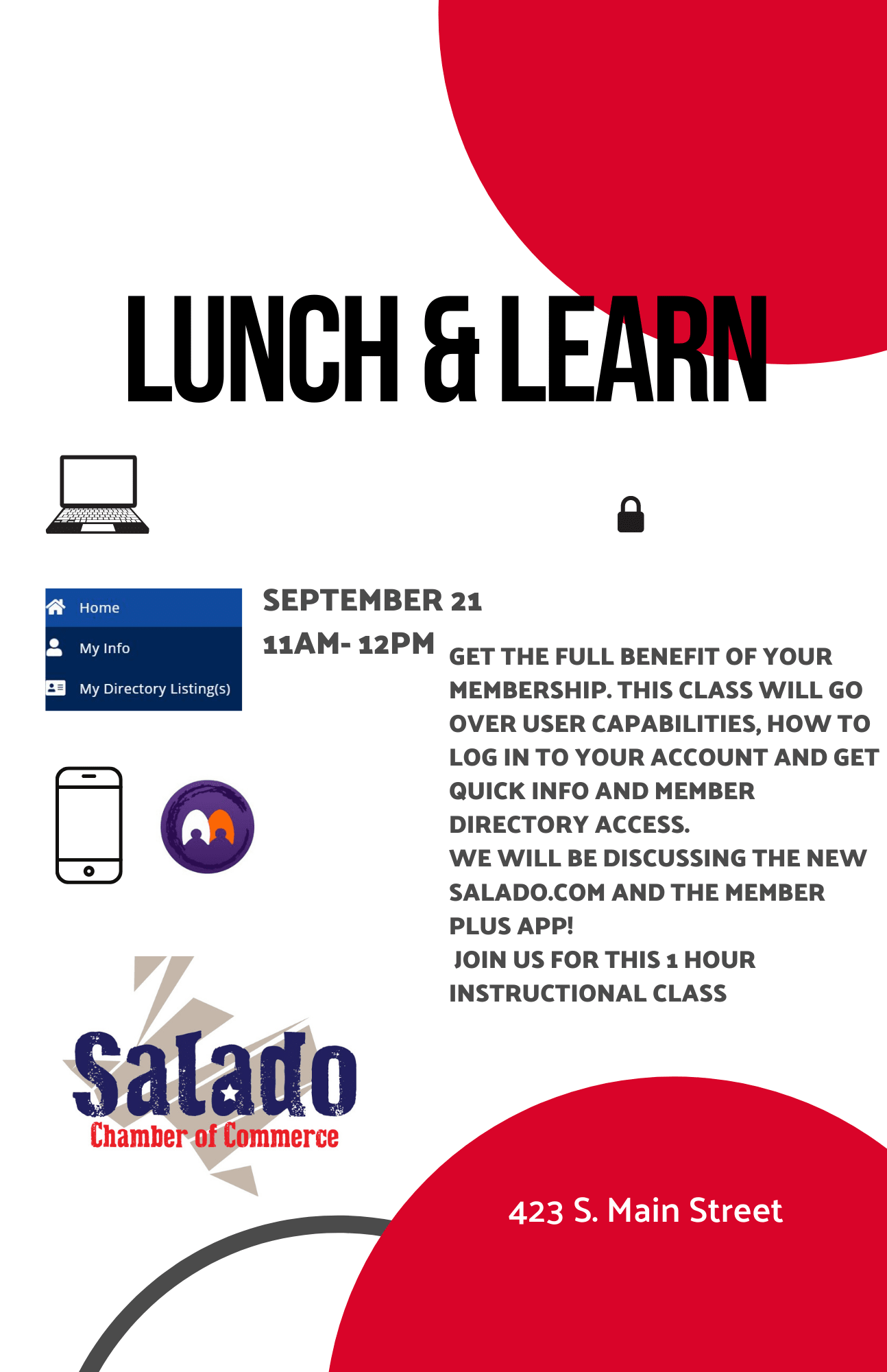 Get the full benefit of your membership. This class will go over user capabilities, how to log in to your account and get quick info and member directory access. We will be discussing the new salado.com and the Member Plus app! Join us for this 1-hour instructional class. Lunch will be provided!
