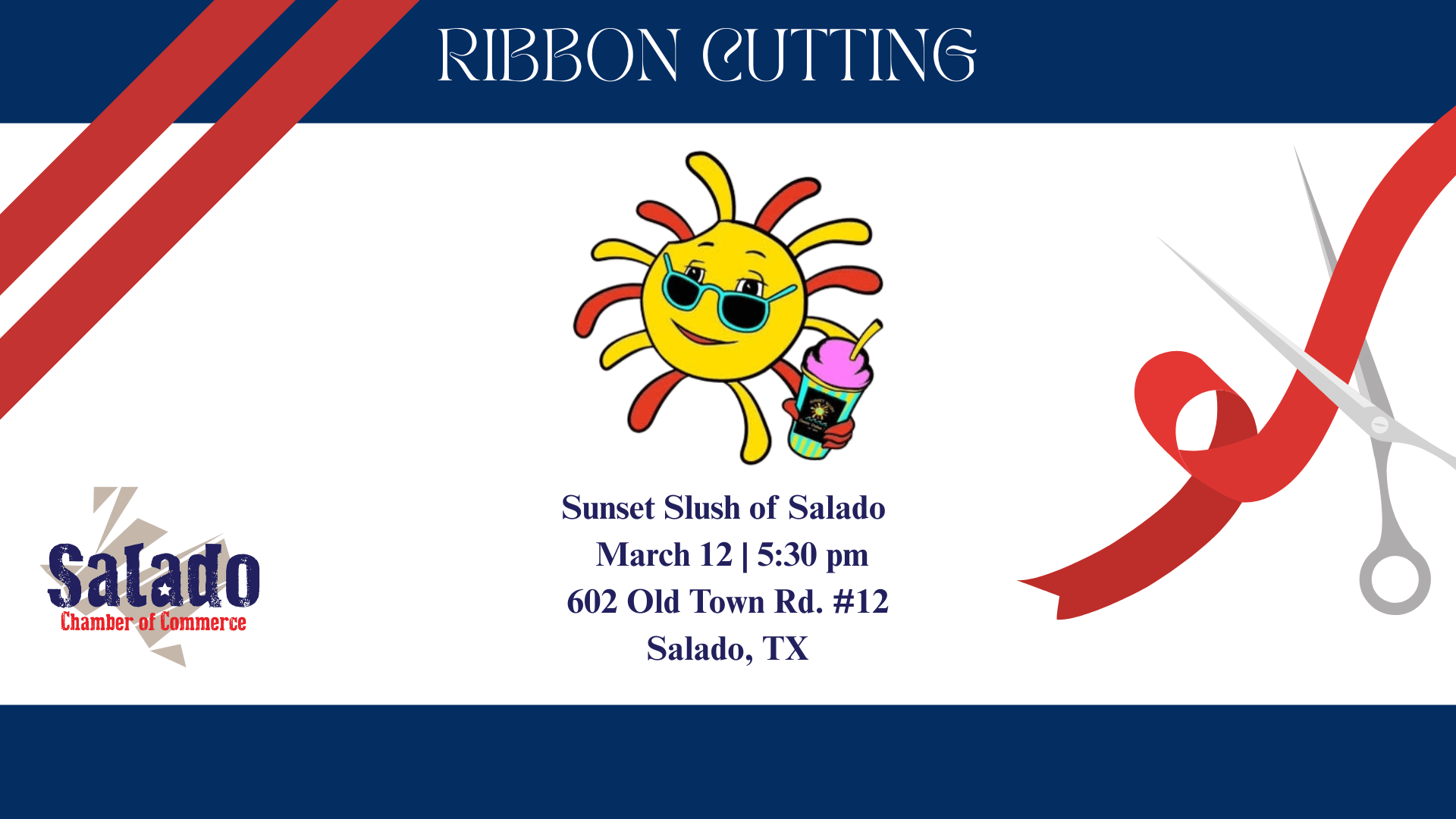 Ribbon Cutting Celebration! Help us welcome Sunset Slush of Salado to our business community! We are excited to celebrate their arrival with an official Ribbon Cutting Ceremony: Thursday, March 12, 5:30 PM Salado Chamber of Commerce Office 602 Old Town Road, Ste. 12, Salado Sunset Slush of Salado brings refreshing treats and vibrant energy to our village, and we’re thrilled to have them join our growing business community. Come out, show your support, and help us give them a warm Salado welcome!
