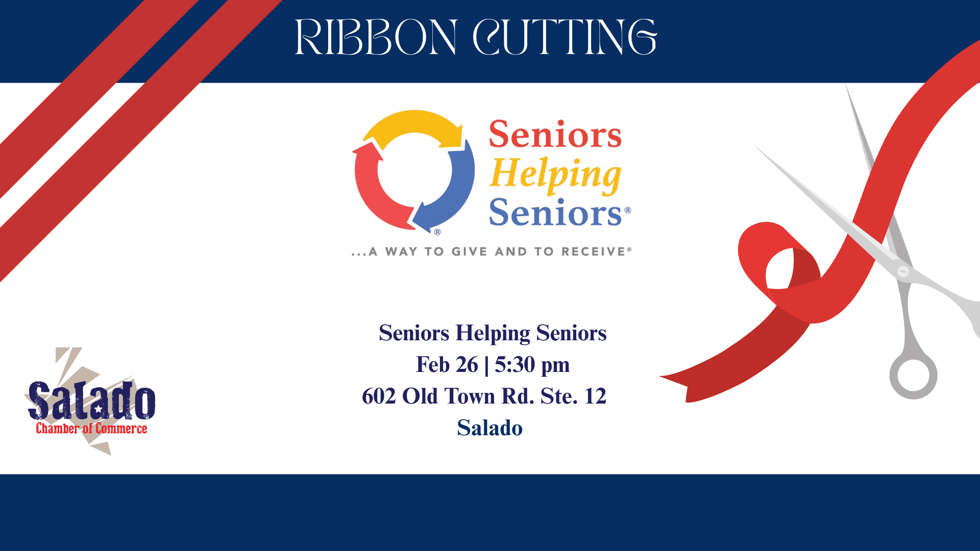 Ribbon Cutting Ceremony Join us as we welcome Seniors Helping Seniors to the Salado business community with a Ribbon Cutting Ceremony! Thursday, February 26 5:30 PM Salado Chamber of Commerce 602 Old Town Rd., Suite 12 Help us celebrate this exciting addition to our business community. This is a great opportunity to show support, network with fellow Chamber members, and learn more about the services Seniors Helping Seniors provides. We hope you’ll join us for this special celebration!