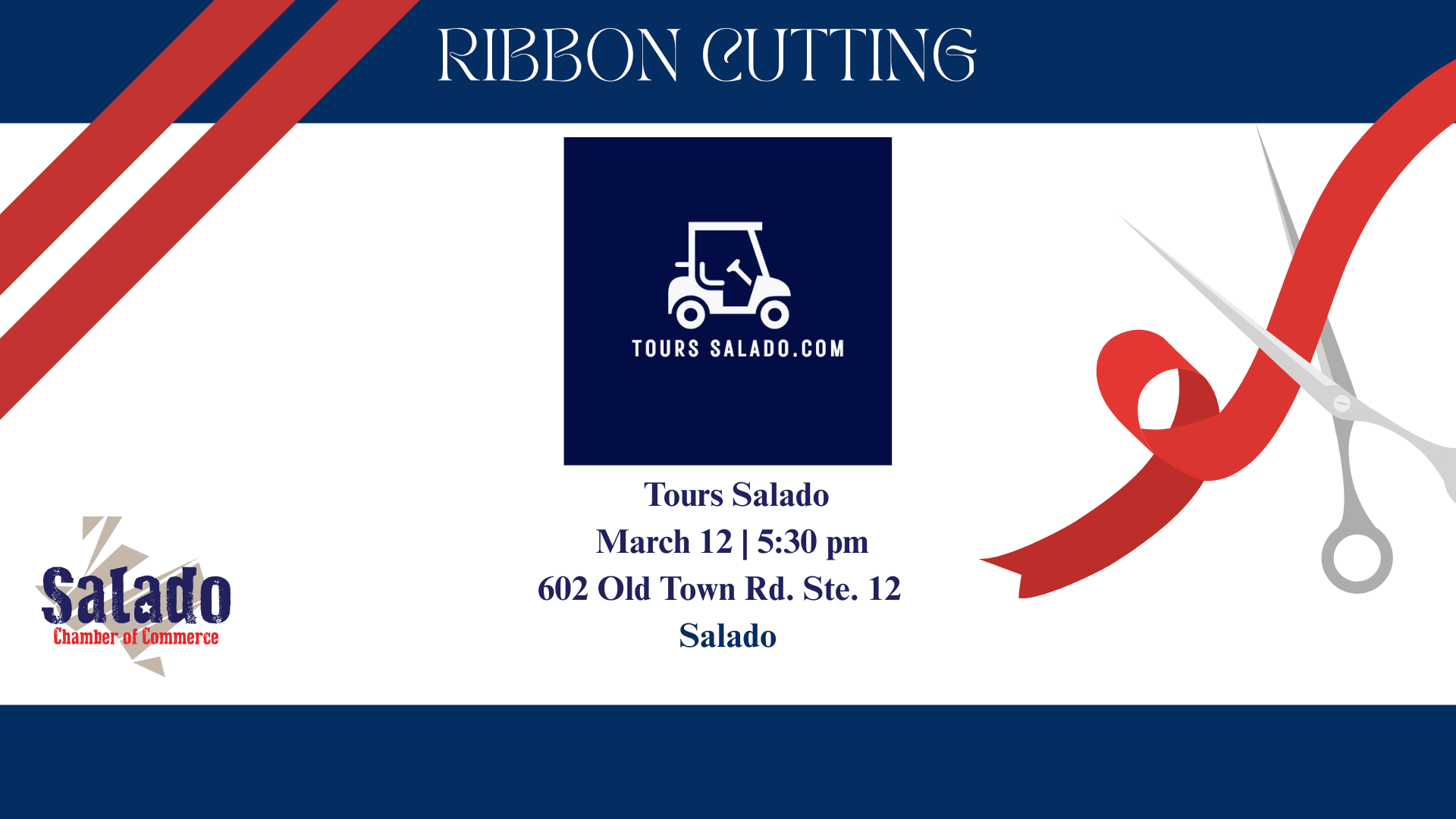 Help Us Welcome Tours Salado to the Community! We are excited to welcome Tours Salado as a new member business in Salado! Tours Salado will be offering guided experiences throughout our village — whether you're interested in historic tours, exploring our unique shops, discovering local eateries, or simply enjoying all that Salado has to offer. Their tours are designed to cater to everyone and highlight the charm, character, and stories that make Salado so special. We’re thrilled to have them here and can’t wait to see the impact they’ll make in connecting visitors and locals to our wonderful community. Join us to celebrate! Thursday, March 12 5:30 PM 602 Old Town Rd., Ste. 12 – Salado Come out, show your support, and help us give Tours Salado a warm Salado welcome!Images