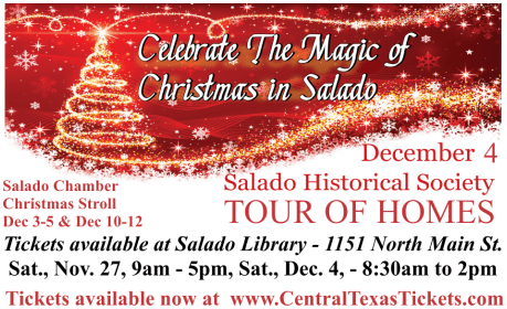 Salado's annual holiday home tour is a fundraiser for the local historical society and a longstanding tradition in the Village. After last year's pandemic-driven cancellation we are anxious to continue this popular event. Salado Historical Society invites you to join in the celebration slated for Saturday, December 4, lasting from 9 until 5. Five homes and the historic Salado cabins will be open and decorated for viewing. Tickets selling for $20 each will be available at the Salado Library at 1151 North Main on November 27, from 9-5 and tickets costing $25 will be available at the library on December 4, (day of event) from 8:30-2. Tickets are also available online at CentralTexastickets.com but will NOT be sold at the homes on the day of the tour. -Wishing you the warmest of holiday wishes- -Salado Historical SocietyImages