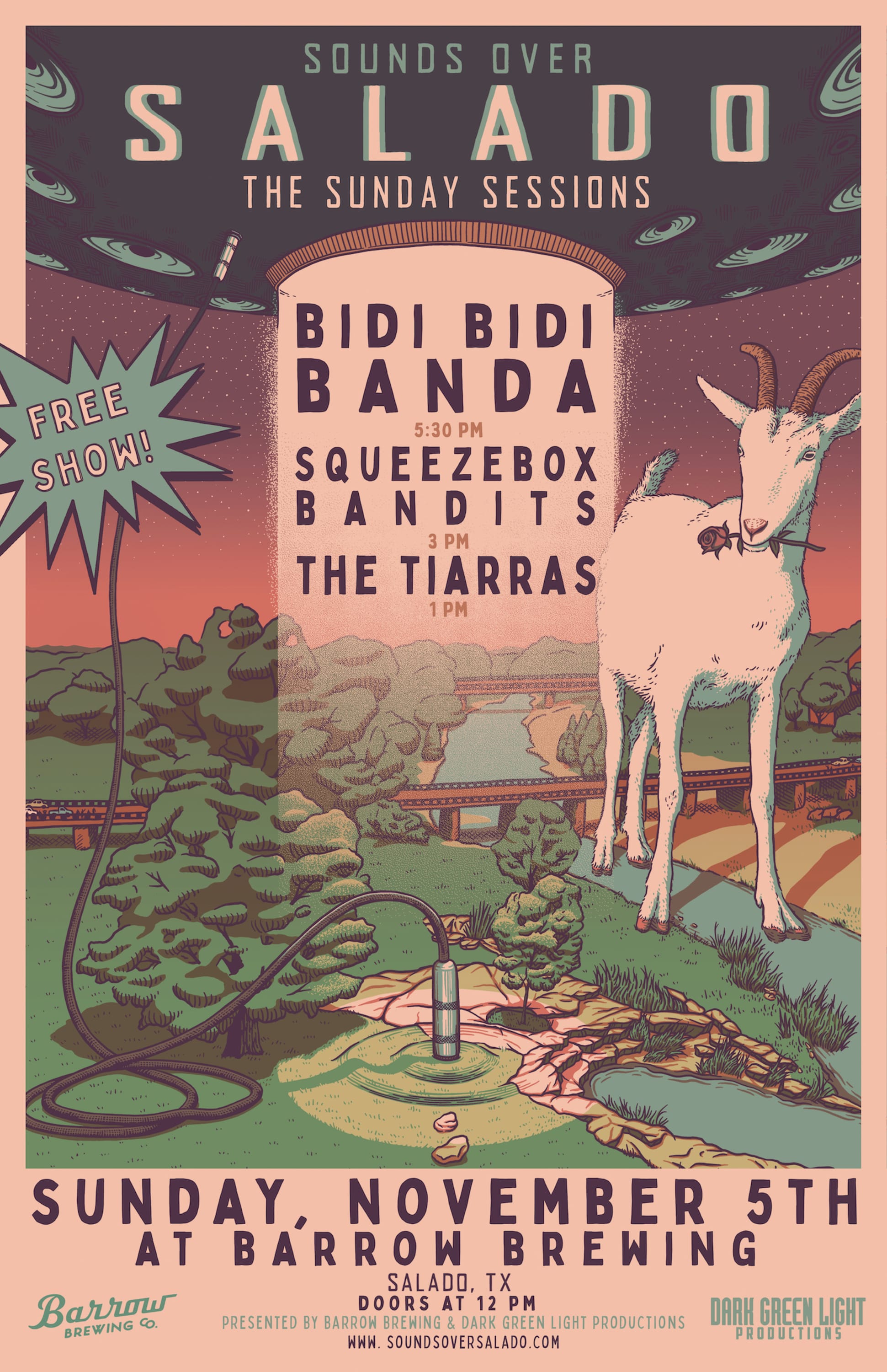 On Sunday, November 5th Sounds Over Salado presents the Sunday Sessions! Featuring the amazing Austin-based Selena tribute band @bidibidibanda as well as @officialsqueezeboxbandits , who mix Tejano with C&W to create a sound that is Texas true, and recent Austin Chronicle cover stars - Latina power trio @thetiarrasofficial In case you missed it - this is a FREE SHOW! Doors are at 12p. Set times: @thetiarrasofficial 1p @officalsqueezeboxbandits 3p @bidibidibanda 5:30p The taps will be flowing and you know the sounds will be proper. Hope to see you there!