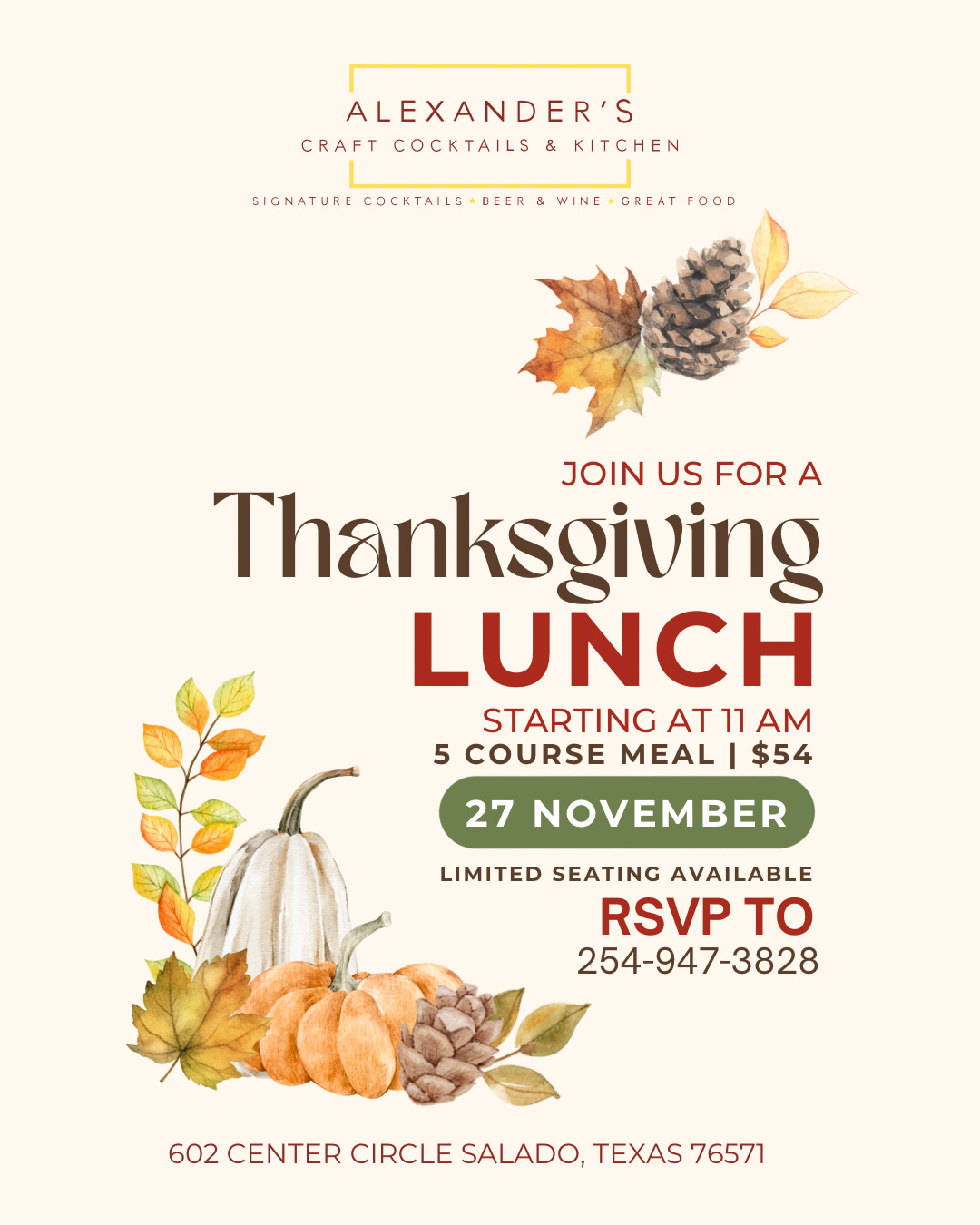 Celebrate Thanksgiving in Style at Alexander’s Craft Cocktails & Kitchen Join us for Alexander’s Annual Thanksgiving Lunch Table, a five-course feast crafted with creativity, tradition, and seasonal elegance. Begin with a delicate amuse-bouche, followed by a velvety pumpkin soup accented with cardamom, ginger, and a cloud of nutmeg cream. Enjoy a crisp autumn salad of mixed greens, dried cranberries, candied pumpkin seeds, apples, and a white balsamic–honey dressing. For your entrée, choose between: Slow-Roasted Turkey Breast with pumpkin spice French toast, green beans almandine, and Luxardo cherry bordelaise. Shaved Prime Rib Roast with Yukon gold potato mille feuille and wild mushroom ragù. Your lunch will concludes with a decadent autumn-inspired dessert. ✨ Experience a holiday tradition reimagined—where warm hospitality meets elevated dining. Seating is limited, so reserve your place at the table today!