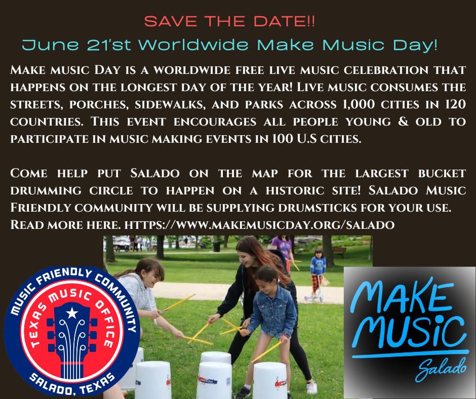 We need your help, please! NO EXPERIENCE NEEDED! June 21st, come out and help us make Salado make history by having the largest bucket drumming circle on a historic site. We'll provide the drumsticks, all you have to do is show up! Please make plans to be there to help us make music history! We're working on having a great weekend of music that weekend, so please make plans to stay for the entire weekend! More details can be found on the link in the photo but we will also be posting more updates. June 21st, in Salado, MAKE MUSIC DAY and make history with us!! #MakeMusicDay #supportlivemusic #bucketdrumcircle #bucketdrums Make Music Day @musicfriendlytexas Texas Music OfficeImages